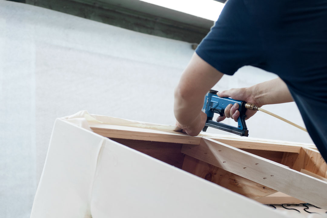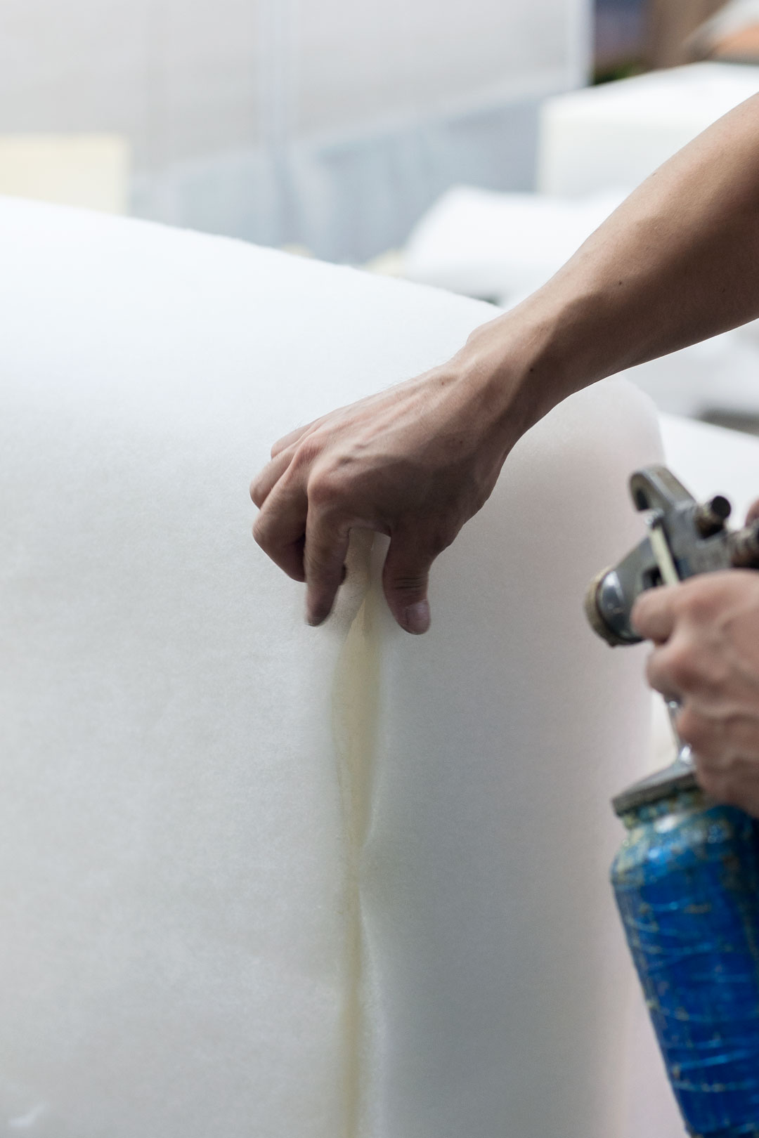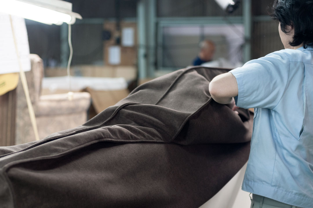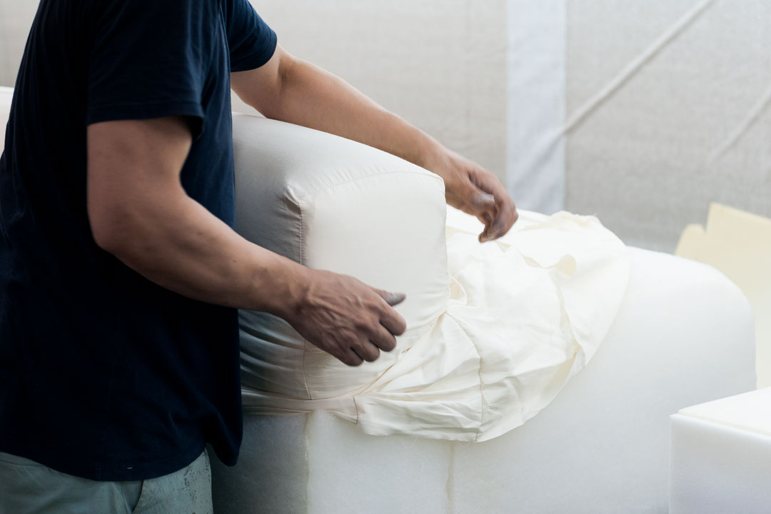 木枠を組みバネを張った後、様々な種類のウレタンフォームを幾重にも肉付けし、さらにその上からフェザーのたっぷり詰まったシートを背座・アームに巻いていきます。とても簡潔なデザインであるMANIですが、フェザーを多用した柔らかな輪郭は一般的なソファよりもステッチ位置やサイズに個体差が生じやすく、製作には高い精度が求められます。工程はほとんどが手作業であり、職人の確かな手と目により、安定した品質が保たれています。完全受注生産制のため、注文を受けてからひとつひとつ国内の工場でつくりあげています。
