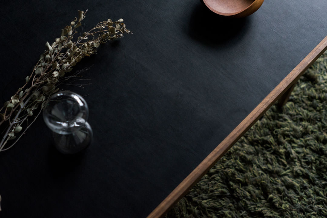 樹脂でコーティングされたピグメントレザーと違い、革の表面は傷や跡がつきやすく、また、水滴のついたグラスを直に置いて放置していると染みになる場合もあるので、コースターやプレイスマットがあった方が良い。最初のうちは神経質になってしまうかもしれないけれど、傷や染みは増えていくうちにだんだん気にならなくなり、いつの間にか味わいに変わる。オイル仕上の無垢材と同じで、使い込みながら育て、変わっていくことを愉しむ、そういう革である。革の色は、合わせやすく落ち着いた色味のブラックとブラウンから選択可。