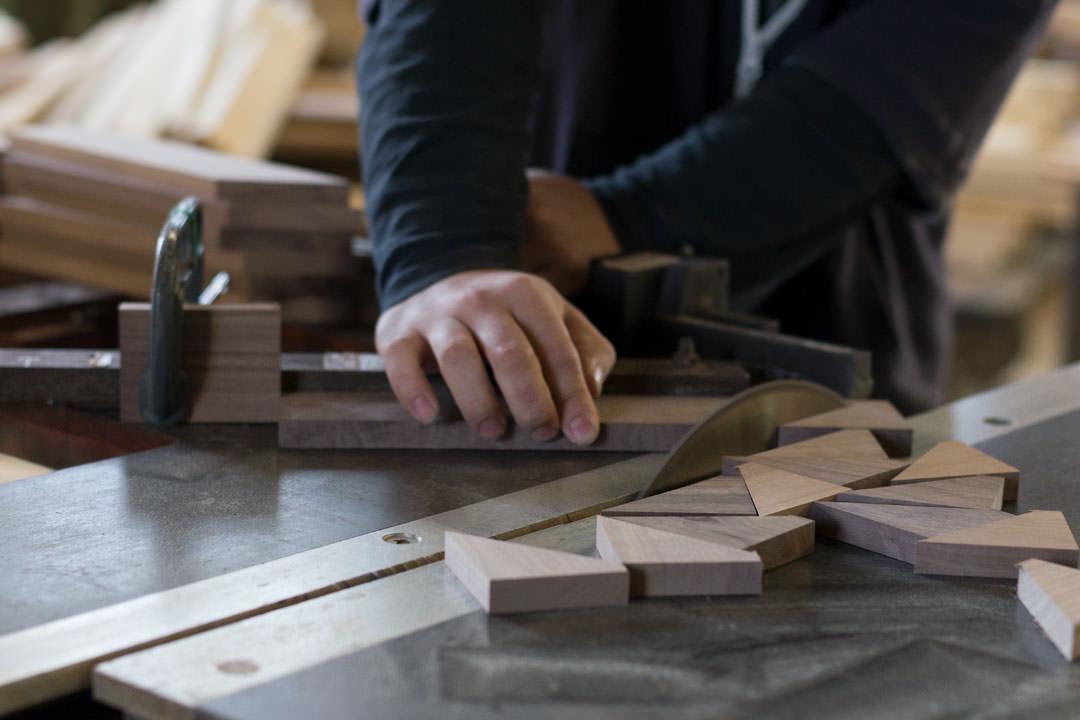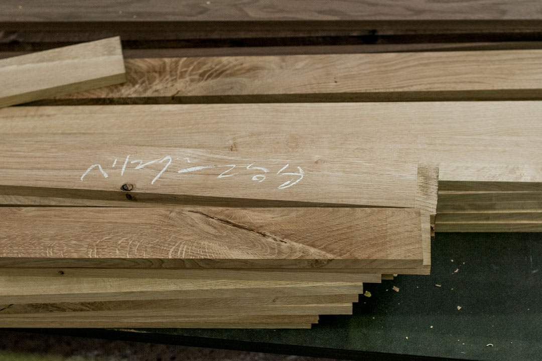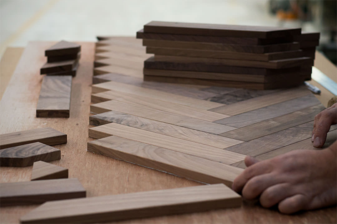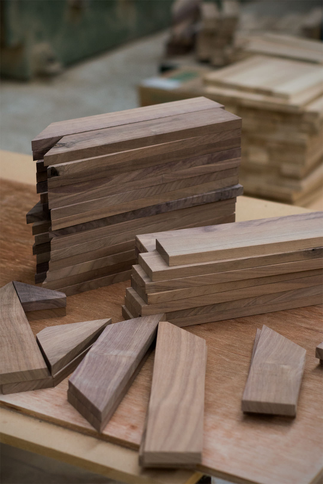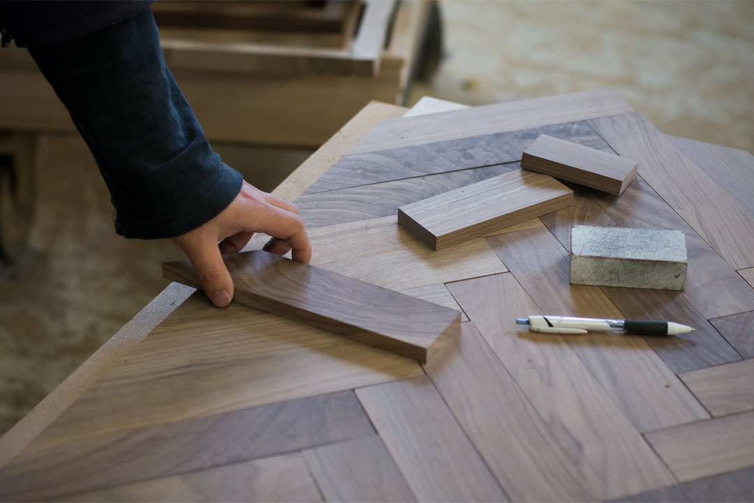 細長い無垢材の板からヘリンボーンを構成するピースを切り出しながら、そのそばで同時に天板を仮組みしていきます。その後、それらのピースひとつひとつに面取りを施し、全体的な木目のバランスを考慮しながら下地に接着。こうして、一つとして同じものがない天板が出来上がります。Ms.HERRINGはそのデザイン上、様々な表情を持つ無垢材ピースの配置により大きく印象が左右され、その仕上りは、図面には表れない職人の感性によって支えられています。