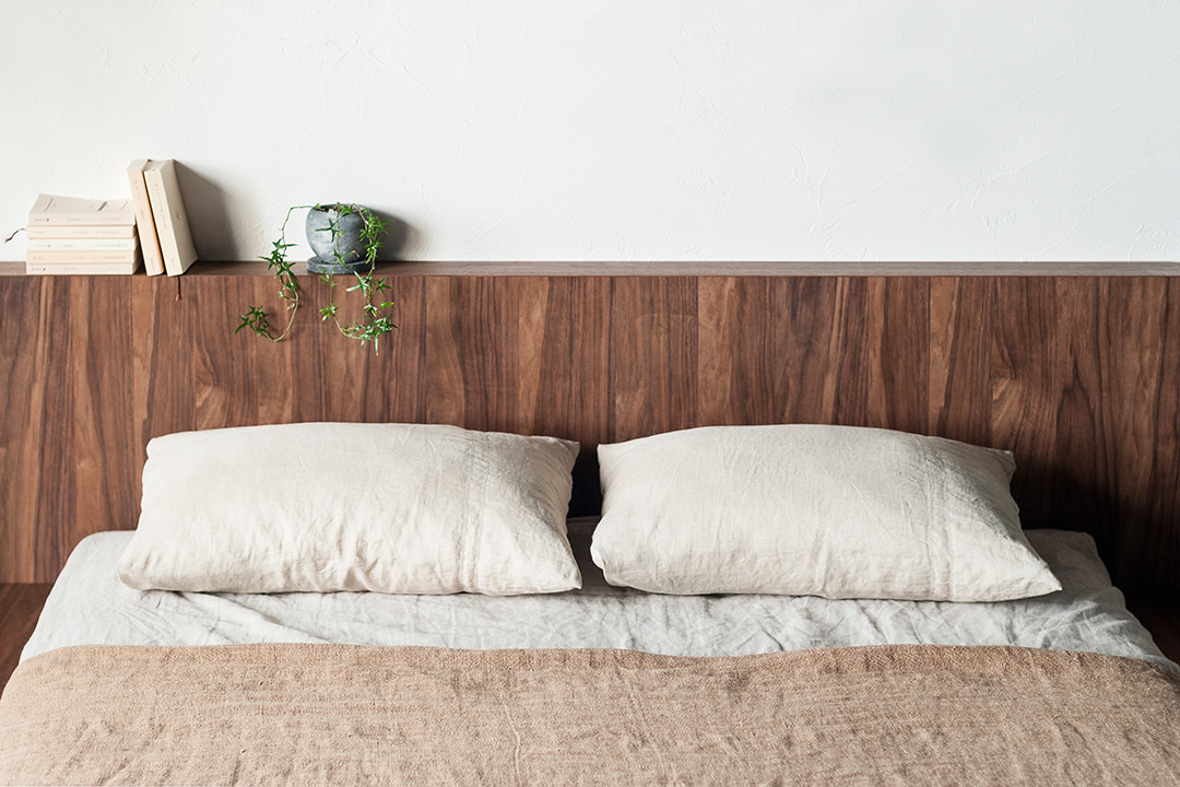 低く、どっしりと重厚なベッドだから、ブラックウォールナットの落ち着いた色合い、シックな木目ととても相性が良い。ウォールナットの仕上は無着色のオイルフィニッシュで、本来の色、風合いのまま。さらっとした自然な素材感は、とりわけリネンやコットンのファブリックがよく似合う。冬は柄物のウールブランケットなんかを合わせてみると、また違った顔を見せてくれそうだ。ベッドリネンのコーディネートは悩ましいけれど、あれこれ試しながら自分好みを探っていくと、より楽しく付き合っていけると思う。